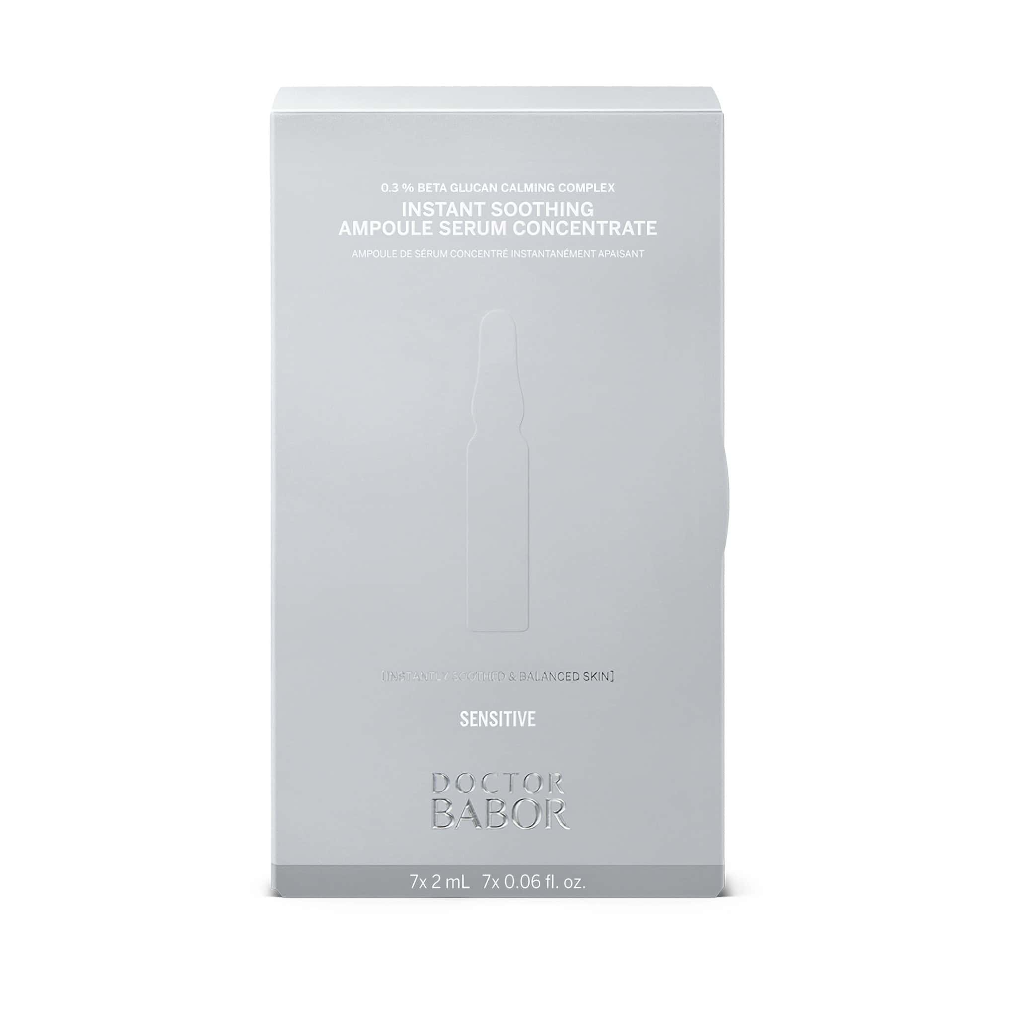 Babor Instant Soothing Ampoule Serum Concentrate ett ampullkoncentrat för omedelbar lindring av irriterad och stressad hud. Beta-glukan, mikrosilver och multimolekylära hyaluronsyror lindrar snabbt rodnad, irritation och stramhet. Minskad hudkänslighet vid regelbunden användning
